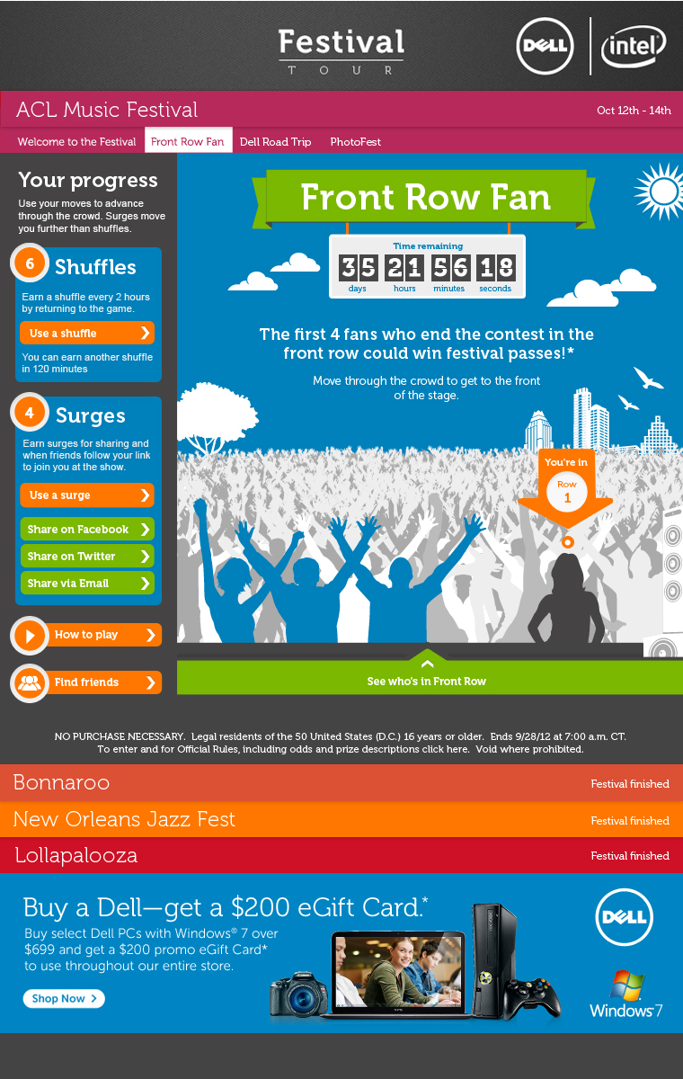 The second exciting app Dell has launched, as of September 24th, is called “Front Row Fan,” which is essentially a game where users have to try to get to the front of the crowd, in hopes of winning ACL tickets and various prizes, including the new Dell Ultrabook.