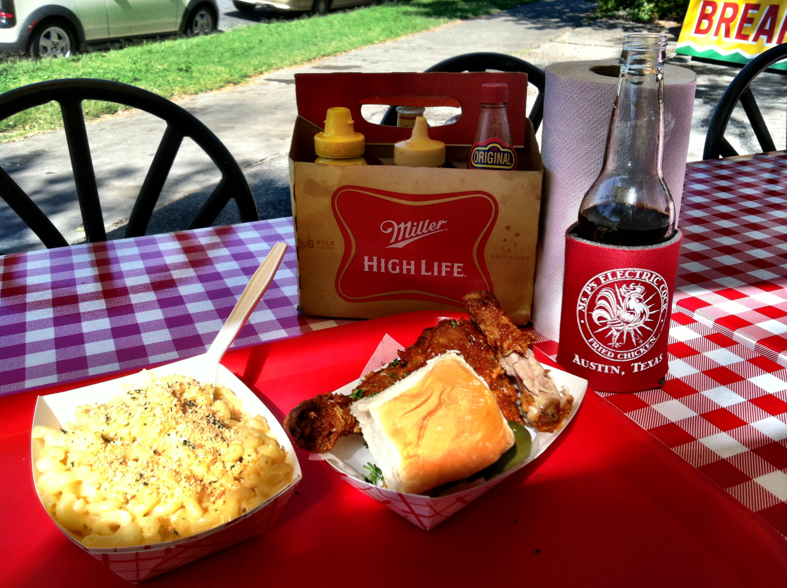 As for the fried chicken – served “spicy and juicy” with Ms. P’s “electric love” – along with a roll and jalapenos (another great touch), the best part is how Ms. P prepares the bird…with a “Texas two-step” brining process, fresh herbs and 12 spices, then the finishing touch by frying the chicken in top quality peanut oil. Best of all, Ms. P only serves FRESH, never frozen, no hormones, no additives and, even better, LOCAL free range chicken. The end result is among the most flavorful, moist, crispy, fried chicken that I’ve come across, certainly among the very best here in Austin.