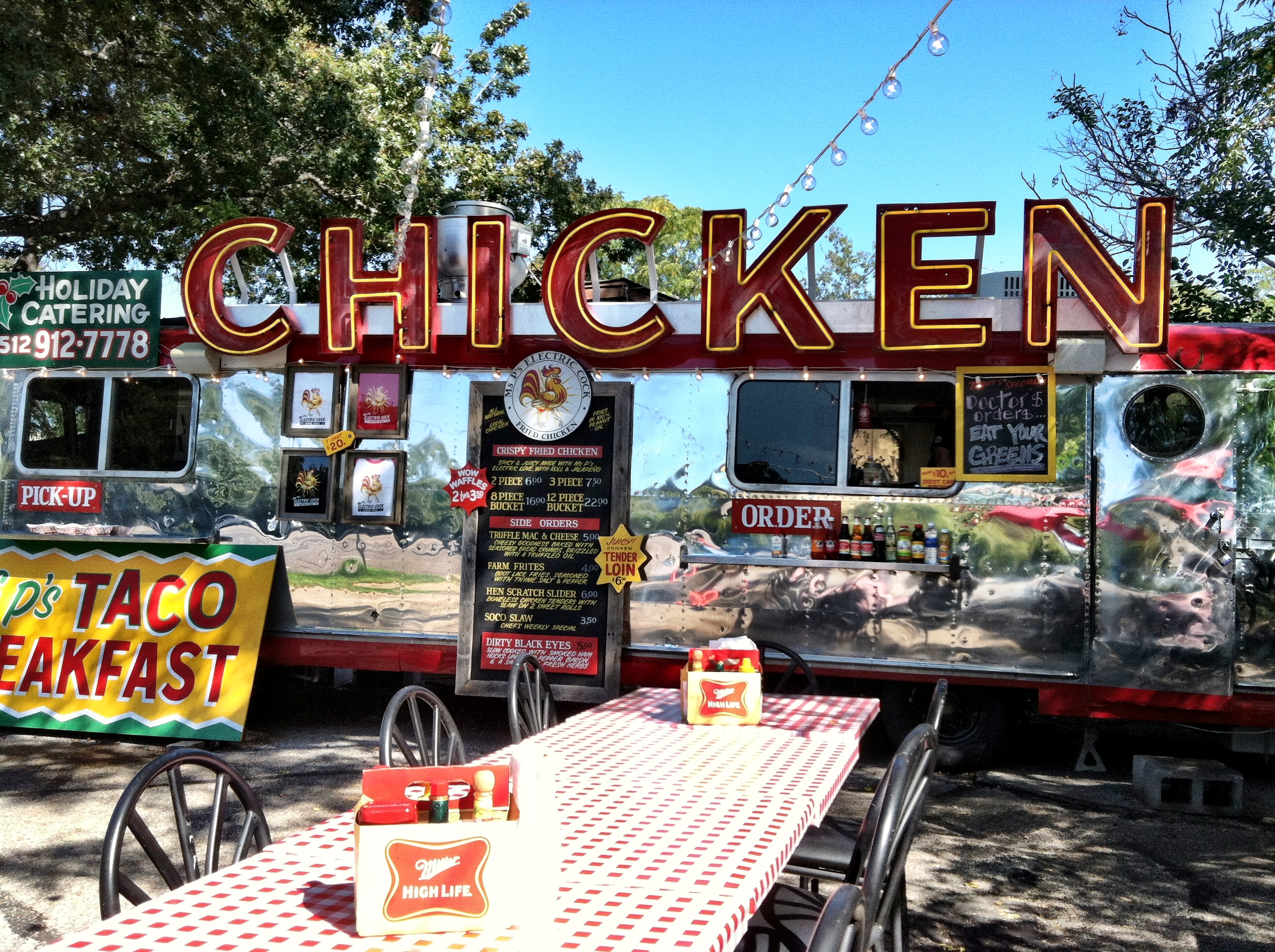 Hard to miss with the striking neon sign above the shiny Airstream proudly touting “CHICKEN,” located just south of Doc’s Motorworks, Storyville and Parts & Labour on SoCo, Ms. P’s is a killer destination for the finest guilty pleasures in the food realm.